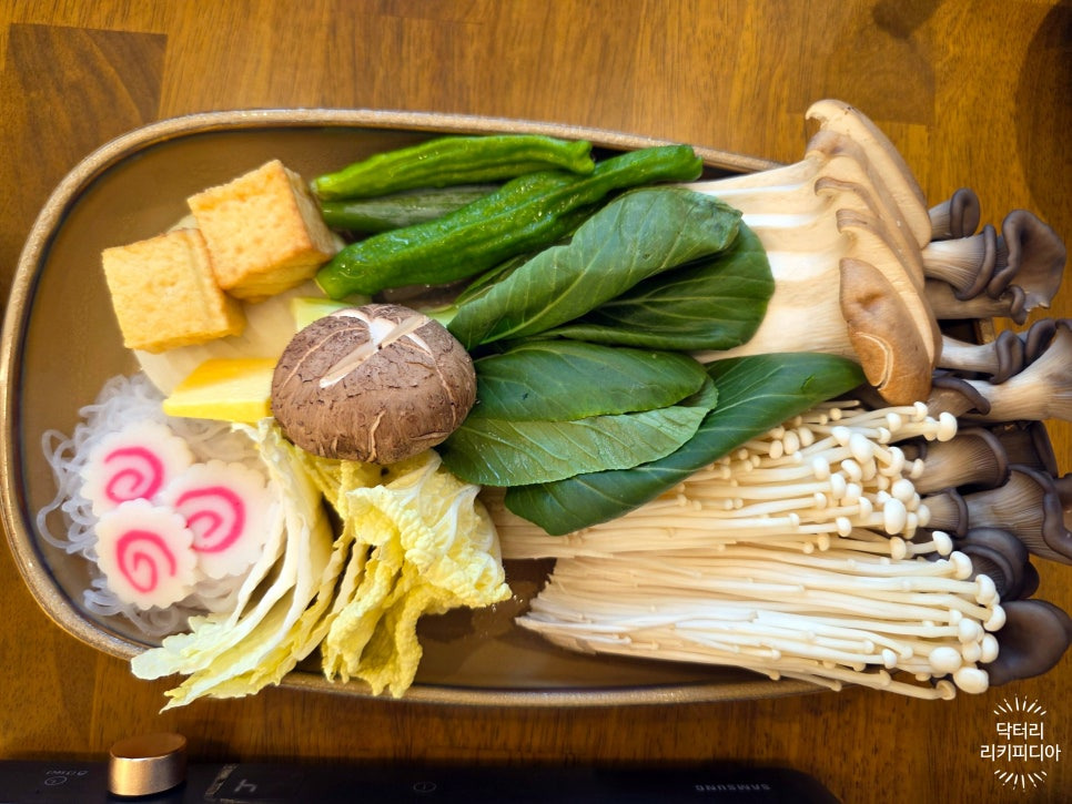 육수에 푹 졸여진 각종 버섯, 야채와, 고기,