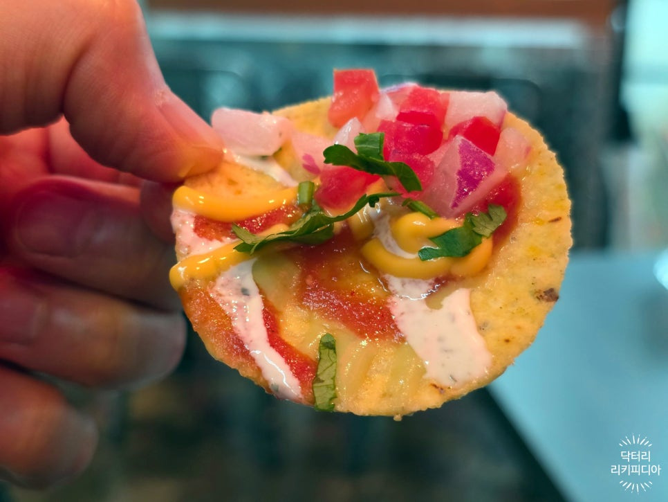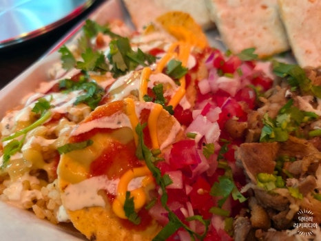 나초칩 위에는 치즈와 사워소스가 뿌려져 있는데