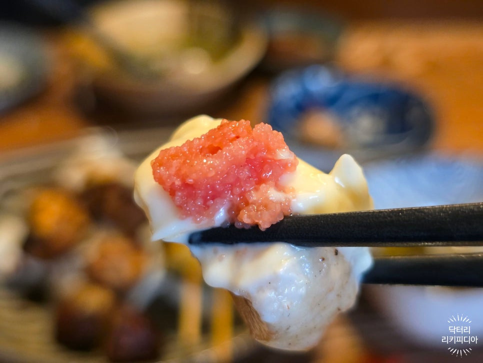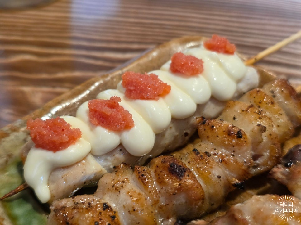 마요네즈와 명란으로 마무리 된 꼬치예요.
