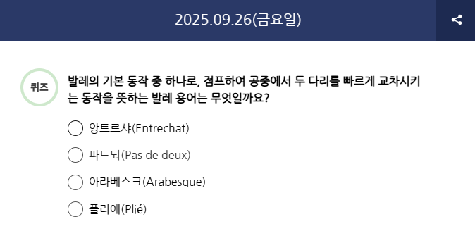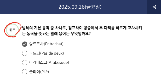 Q) 발레의 기본 동작 중 하나로, 점프하여 공중에서 두 다리를 빠르게 교차시키는 동작을 뜻하는 발레 용어는 무엇일까요?