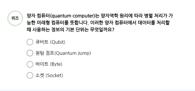 Q) 양자 컴퓨터(quantum computer)는 양자역학 원리에 따라 병렬 처리가 가능한 미래형 컴퓨터를 뜻합니다. 이러한 양자 컴퓨터에서 데이터를 처리할 때 사용하는 정보의 기본 단위는 무엇일까요?