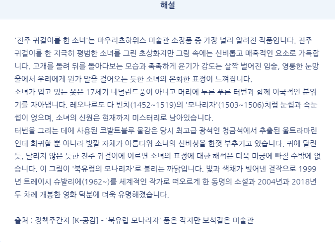 '진주 귀걸이를 한 소녀'는 마우리츠하위스 미술관 소장품 중 가장 널리 알려진 작품입니다.