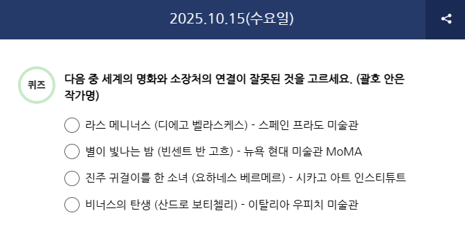 Q) 다음 중 세계의 명화와 소장처의 연결이 잘못된 것을 고르세요. (괄호 안은 작가명)