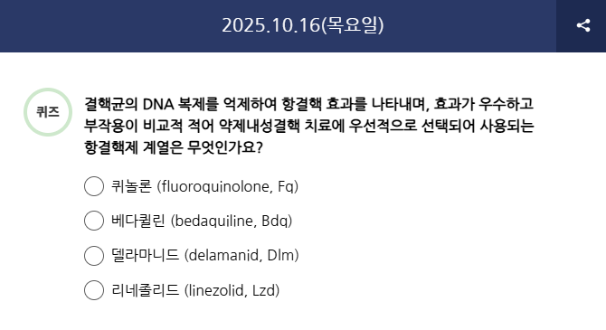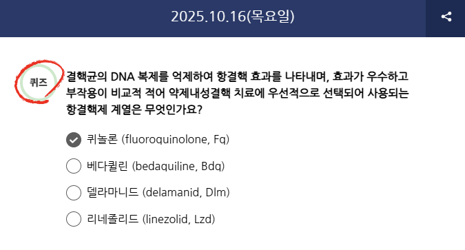 Q) 결핵균의 DNA 복제를 억제하여 항결핵 효과를 나타내며, 효과가 우수하고 부작용이 비교적 적어 약제내성결핵 치료에 우선적으로 선택되어 사용되는 항결핵제 계열은 무엇인가요?