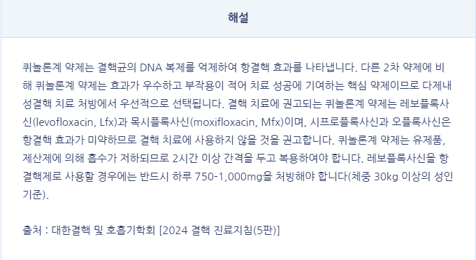 다른 2차 약제에 비해 퀴놀론계 약제는 효과가 우수하고 부작용이 적어 치료 성공에 기여하는 핵심 약제이므로 다제내성결핵 치료 처방에서 우선적으로 선택됩니다.