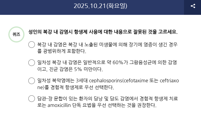 Q) 성인의 복강 내 감염시 항생제 사용에 대한 내용으로 잘못된 것을 고르세요.