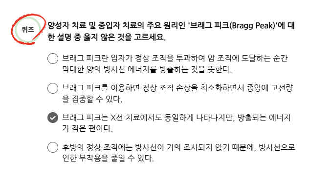 정답은 3)번 브래그 피크는 X선 치료에서도 동일하게 나타나지만, 방출되는 에너지가 적은 편이다.입니다.