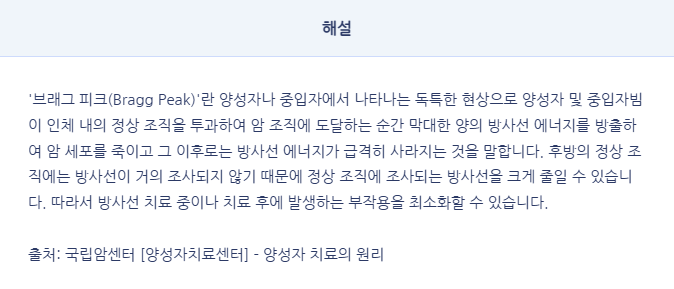 1) 브래그 피크란 입자가 정상 조직을 투과하여 암 조직에 도달하는 순간 막대한 양의 방사선 에너지를 방출하는 것을 뜻한다.