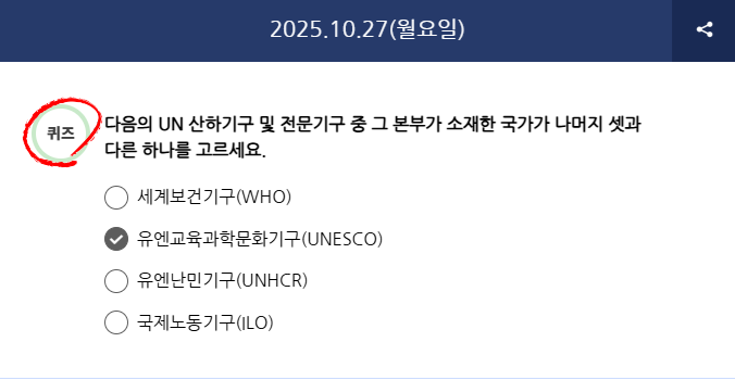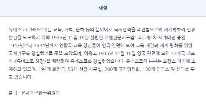 정답은 2)번 유엔교육과학문화기구(UNESCO) 입니다.