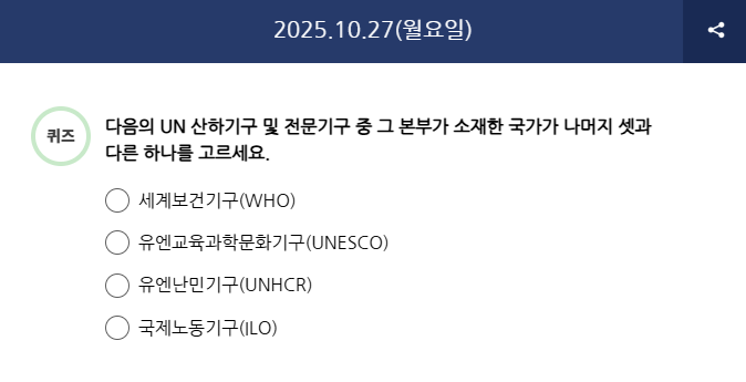 Q) 다음의 UN 산하기구 및 전문기구 중 그 본부가 소재한 국가가 나머지 셋과 다른 하나를 고르세요.