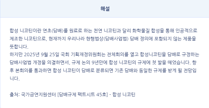 하지만 2025년 9월 25일 국회 기획재정위원회는 전체회의를 열고 합성니코틴을 담배로 규정하는 담배사업법 개정을 의결하면서, 규제 논의 9년만에 합성 니코틴의 규제에 첫 발을 떼었습니다.