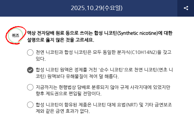 정답은 2)번 합성 니코틴 원액은 정제를 거친 '순수 니코틴'으로 천연 니코틴(연초 니코틴) 원액보다 유해물질이 적어 덜 해롭다. 입니다.