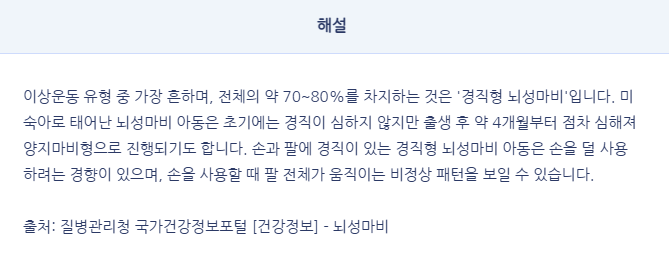 이상운동 유형 중 가장 흔하며, 전체의 약 70~80%를 차지하는 것은 '경직형 뇌성마비'입니다.