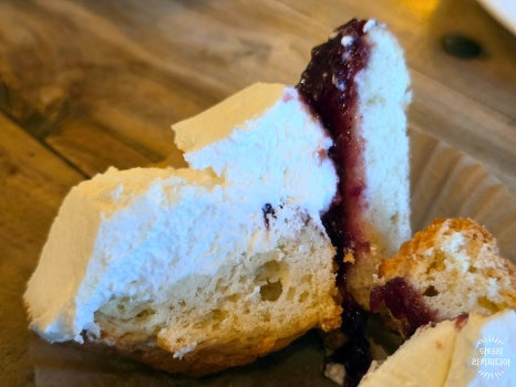 엄청난 양의 생크림과 라즈베리 잼이 들어있어요.
