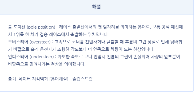 폴 포지션 (pole position) : 레이스 출발선에서의 맨 앞자리를 의미하는 용어로, 보통 공식 예선에서 1위를 한 차가 결승 레이스에서 출발하는 위치입니다.