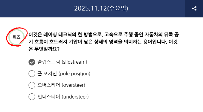 Q) 이것은 레이싱 테크닉의 한 방법으로, 고속으로 주행 중인 자동차의 뒤쪽 공기 흐름이 흐트러져 기압이 낮은 상태의 영역을 의미하는 용어입니다. 이것은 무엇일까요?