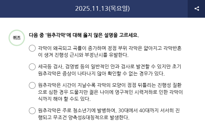 Q) 다음 중 '원추각막'에 대해 옳지 않은 설명을 고르세요.