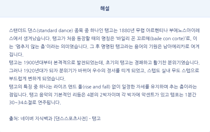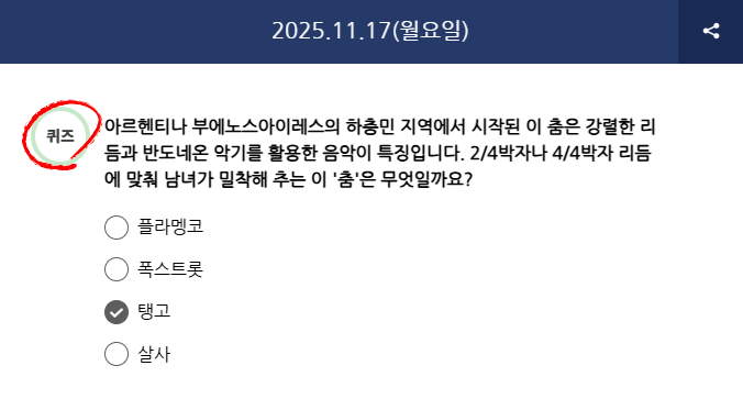 Q) 아르헨티나 부에노스아이레스의 하층민 지역에서 시작된 이 춤은 강렬한 리듬과 반도네온 악기를 활용한 음악이 특징입니다. 2/4박자나 4/4박자 리듬에 맞춰 남녀가 밀착해 추는 이 '춤'은 무엇일까요?