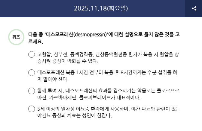 Q) 다음 중 '데스모프레신(desmopressin)'에 대한 설명으로 옳지 않은 것을 고르세요.