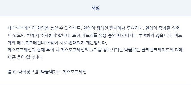 데스모프레신이 혈압을 높일 수 있으므로, 혈압이 정상인 환자에서 투여하고, 혈압이 증가할 위험이 있으면 투여 시 주의해야 합니다.