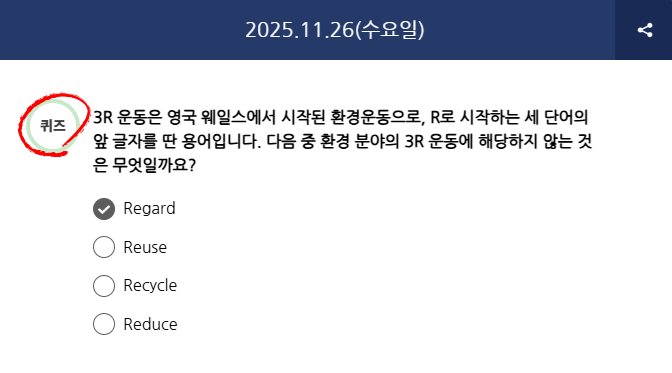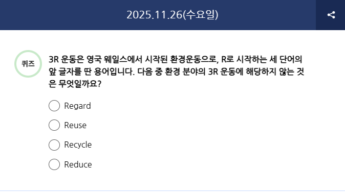 Q) 3R 운동은 영국 웨일스에서 시작된 환경운동으로, R로 시작하는 세 단어의 앞 글자를 딴 용어입니다. 다음 중 환경 분야의 3R 운동에 해당하지 않는 것은 무엇일까요?