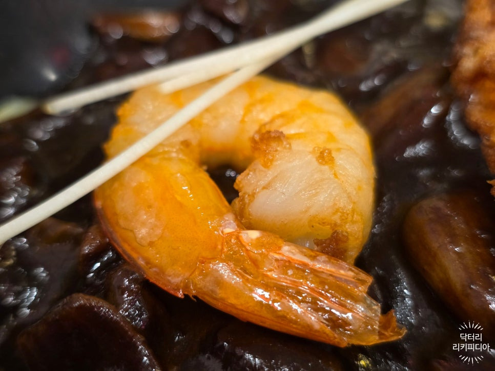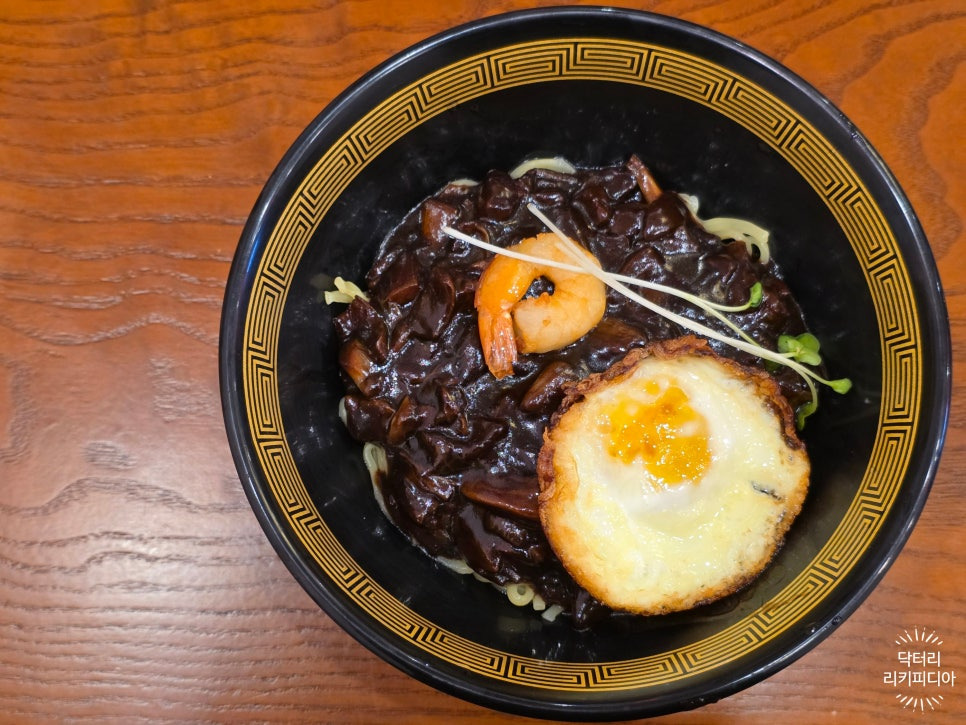 : 중식계란프라이와 새우가 들어간 맛있는 짜장면