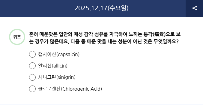 Q) 흔히 매운맛은 입안의 체성 감각 섬유를 자극하여 느끼는 통각(痛覺)으로 보는 경우가 많은데요, 다음 중 매운 맛을 내는 성분이 아닌 것은 무엇일까요?