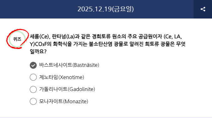 Q) 세륨(Ce), 란타넘(La)과 같은 경희토류 원소의 주요 공급원이자 (Ce, LA, Y)CO₃F의 화학식을 가지는 불소탄산염 광물로 알려진 희토류 광물은 무엇일까요?