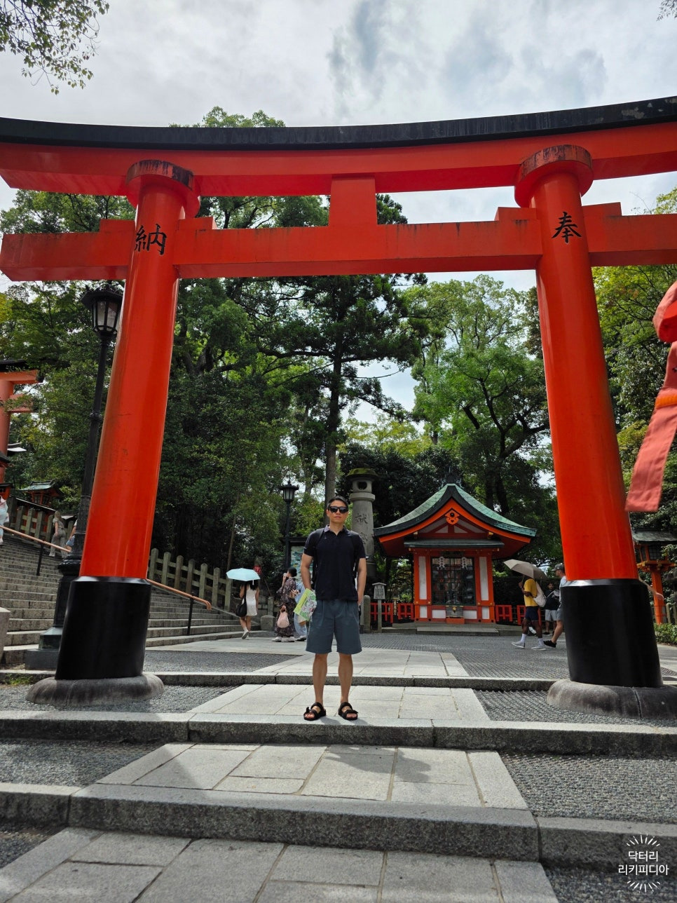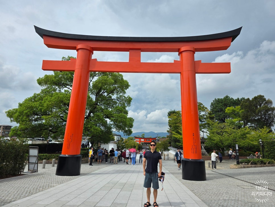 입구에 있는 거대 토리이 앞에서