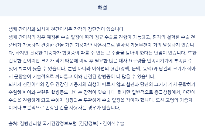 Q) 다음 중 간이식 수술에 대한 설명으로 옳지 않은 것을 고르세요.