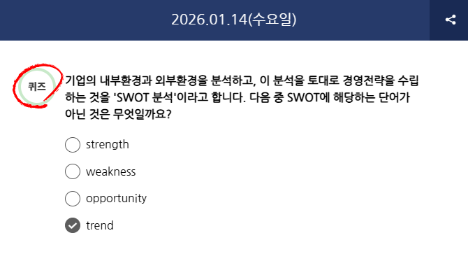 Q) 기업의 내부환경과 외부환경을 분석하고, 이 분석을 토대로 경영전략을 수립하는 것을 'SWOT 분석'이라고 합니다. 다음 중 SWOT에 해당하는 단어가 아닌 것은 무엇일까요?