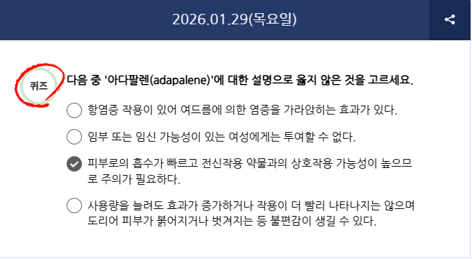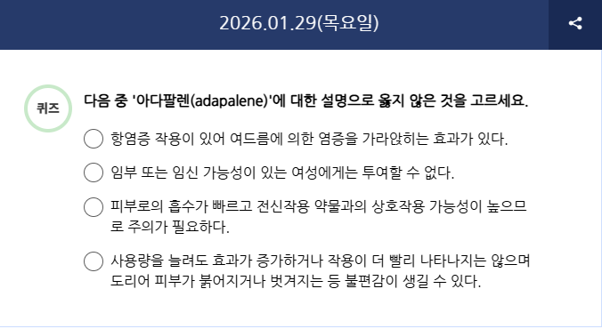 Q) 다음 중 '아다팔렌(adapalene)'에 대한 설명으로 옳지 않은 것을 고르세요.