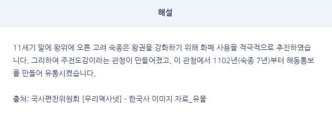 그리하여 주전도감이라는 관청이 만들어졌고, 이 관청에서 1102년(숙종 7년)부터 해동통보를 만들어 유통시켰습니다.