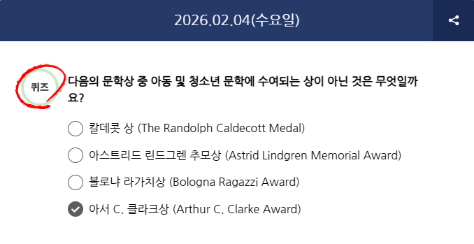 정답은 4)번 아서 C. 클라크상 (Arthur C. Clarke Award)입니다.