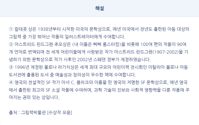 ③ 1996년 제정된 볼로냐 라가치상은 세계 최대 규모의 어린이책 전시회인 이탈리아 볼로냐 아동도서전에 출품된 도서 중 예술성과 창의성이 우수한 책에 수여합니다.