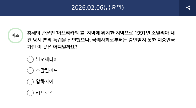 Q) 홍해의 관문인 ‘아프리카의 뿔’ 지역에 위치한 지역으로 1991년 소말리아 내전 당시 분리 독립을 선언했으나, 국제사회로부터는 승인받지 못한 미승인국가인 이 곳은 어디일까요?