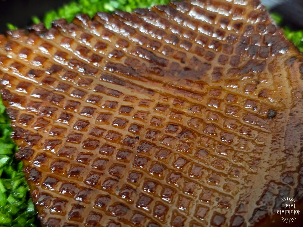 간장양념하여 잘 구워진 돼지껍데기의 조화...