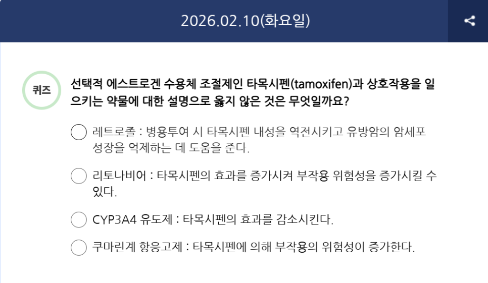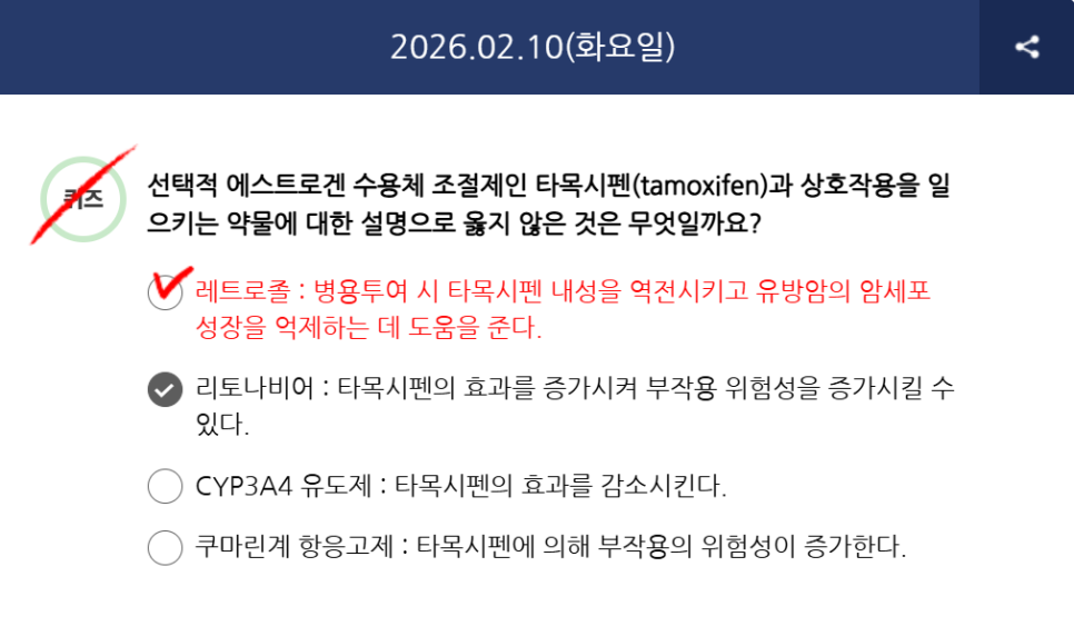 Q) 선택적 에스트로겐 수용체 조절제인 타목시펜(tamoxifen)과 상호작용을 일으키는 약물에 대한 설명으로 옳지 않은 것은 무엇일까요?