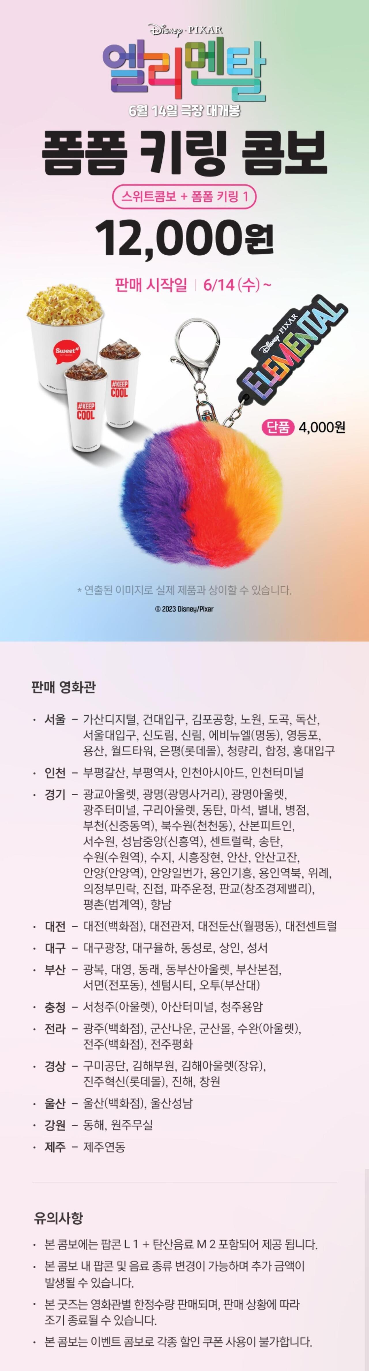 기존의 스위트콤보(팝콘 L 1 + 탄산음료 M 2, 10,000원) + 엘리멘탈 폼폼 키링 = 12,000원이니까 키링을 2,000원에 사는 셈이다. 단품으로 구매하면 4,000원이다.