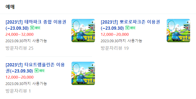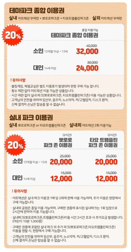 종합이용권(무제한), 뽀로로파크존 or 타요트램폴린존(2회), BIG 3(3회), BIG5(5회)