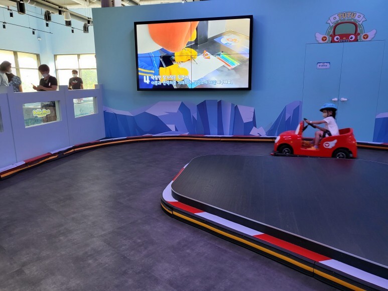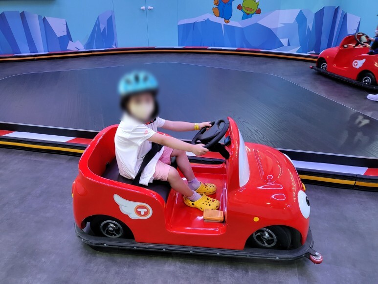 뚜뚜의 스피드트랙은 작은 자동차를 운전하는 겁니다.(100cm 이상은 아이 단독 탑승 가능, 90cm 이하는 보호자와 동반 탑승 가능) 우측 발 아래에 있는 엑셀러레이터를 밟으면 자동차가 움직입니다. 안전을 위해서 헬맷과 미끄럼 방지용 크록스를 신고 타야 합니다. 저희 딸은 5살인데 생각보다 운전을 잘 하더라구요. 2~3바퀴 정도 탈 수 있습니다.
