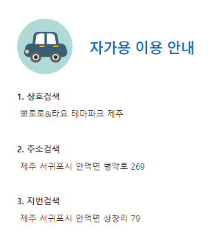 "뽀로로&타요 테마파크 제주"를 검색하시면 되고, 주소와 지번은 위와 같습니다.
