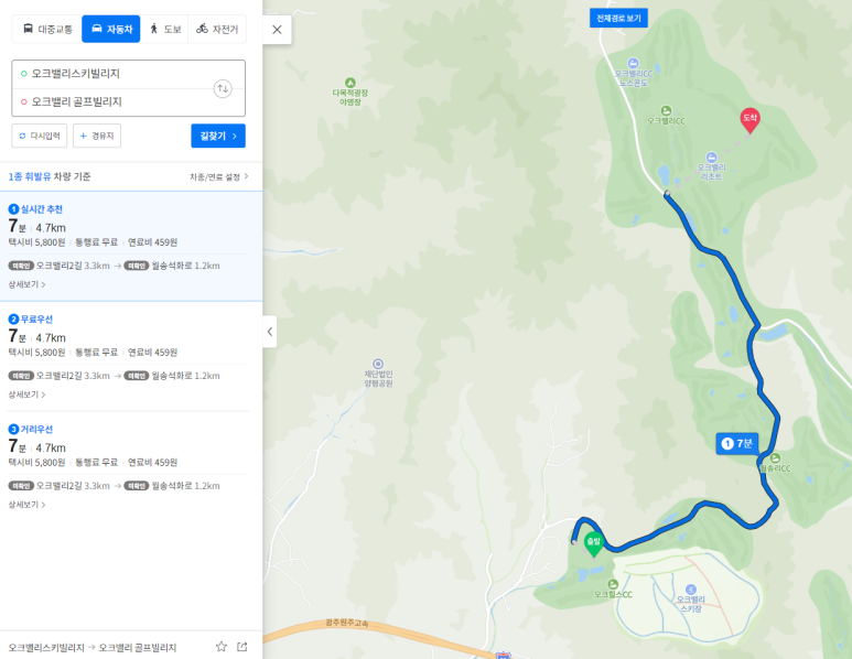 오크밸리의 숙박시설은 크게 골프빌리지와 스키빌리지로 되어 있는데요. 두 숙박시설의 거리는 상당히 먼 편입니다(산길을 4.7km나 운전해서 가야합니다.)