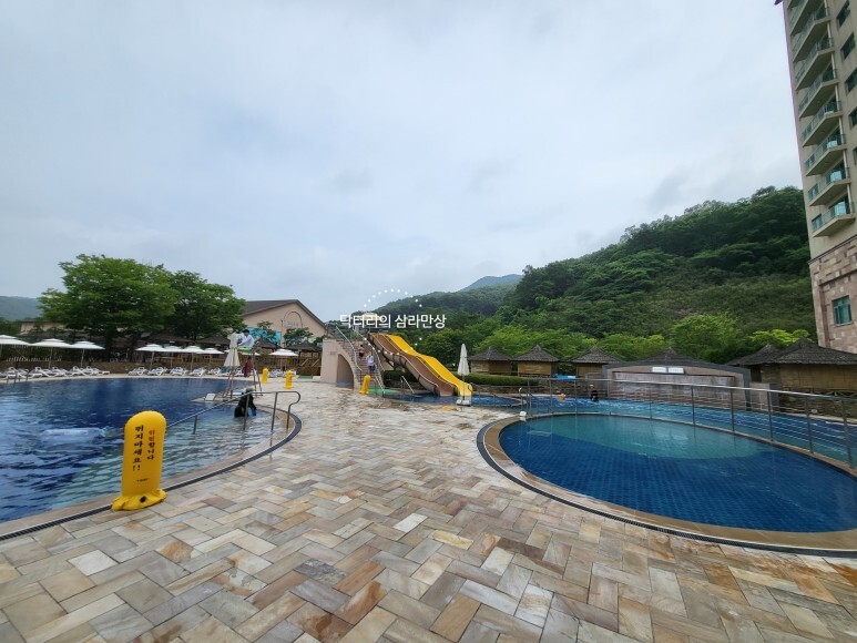 야외로 나가면 좌측에 큰 수영장이 하나 있구요, 우측에는 유아용풀과 그것보다 조금 더 깊은 풀이 있고, 슬라이드가 2개 있습니다.