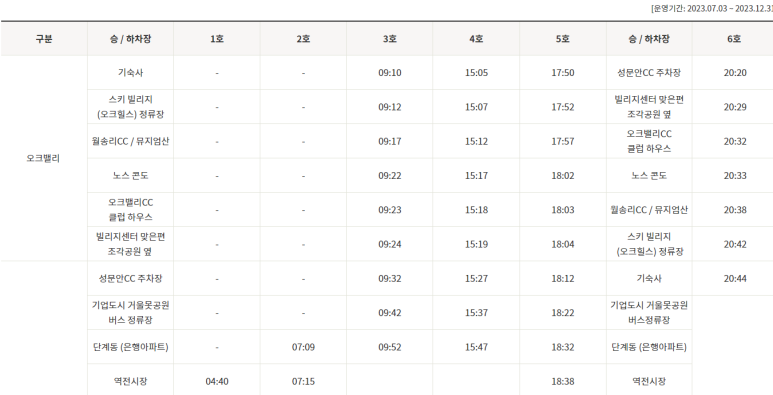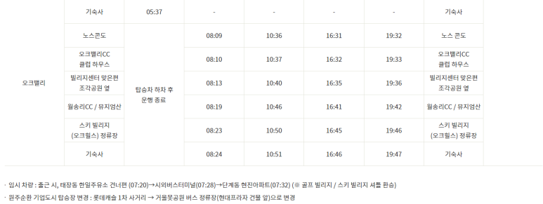 셔틀버스로는 오크밸리까지 약 40분 거리입니다(약 20.5km)