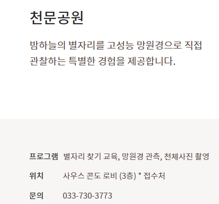 오크밸리에 투숙하거나 오크밸리 인근에 투숙하시는 분들은 이전에 천문대 경험이 없으시다면 한번쯤 체험해보는 것을 추천드립니다.