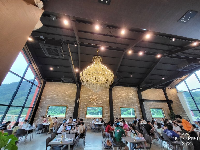 안으로 들어가면 넓은 홀과 천장의 화려한 샹드리에가 눈에 확 들어옵니다. 천장도 높고, 양쪽 사이드가 통창으로 되어 있어 개방감이 훌륭합니다.