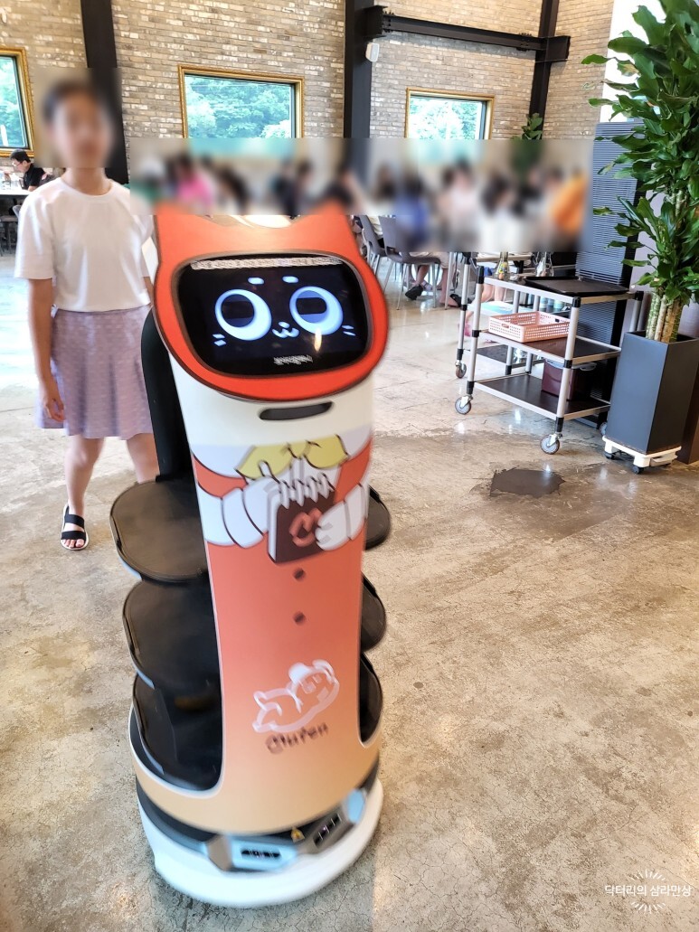 식기 및 좌석 세팅은 종업원이 해주지만, 서빙은 위와 같이 생긴 서빙 로봇 3대가 쉴틈없이 하고 있습니다.