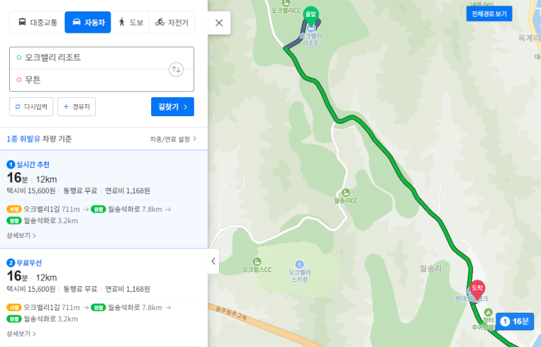 네이버지도에서 검색하면 오크밸리 리조트에서 12km(16분)인 걸로 나오는데요. 실제 거리는 그 반도 안됩니다. 오크밸리에서 무튼으로 향하는 길에서 좌회전이 안되기 때문에 엄청 더 가서 U턴해서 와야 하기에 저렇게 거리가 뜹니다. 정말 불편하기 짝이 없네요.