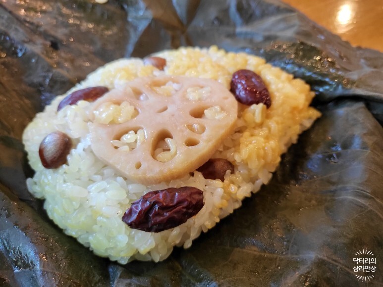 연잎밥은 연잎에 곱게 쌓여서 나오는데, 열어보면 연근, 대추, 은행 등과 함께 연노란색의 연잎밥이 나옵니다. 약간 약식과 비슷한 식감인데 찰지고 맛있습니다.